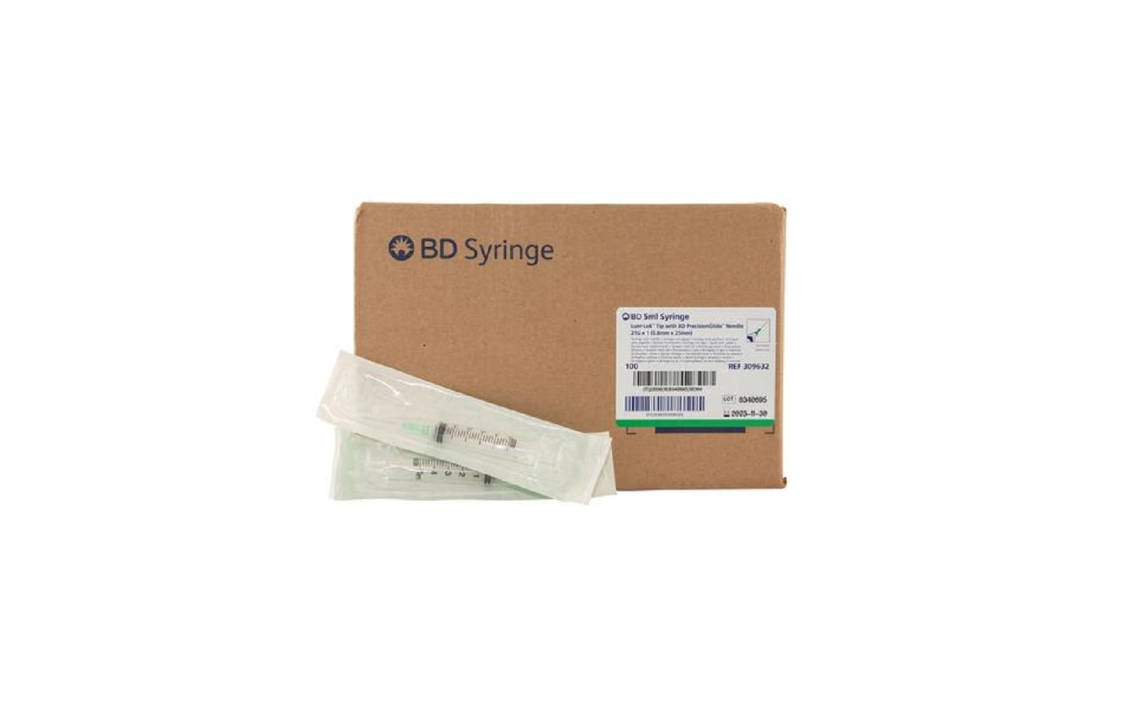 This syringe includes a 5 ml capacity barrel with a Luer-Lok connection to securely attach the included BD PrecisionGlide Needle. The 21-gauge, 1-inch needle features a regular bevel and regular wall, designed for dependable penetration and fluid transfer.